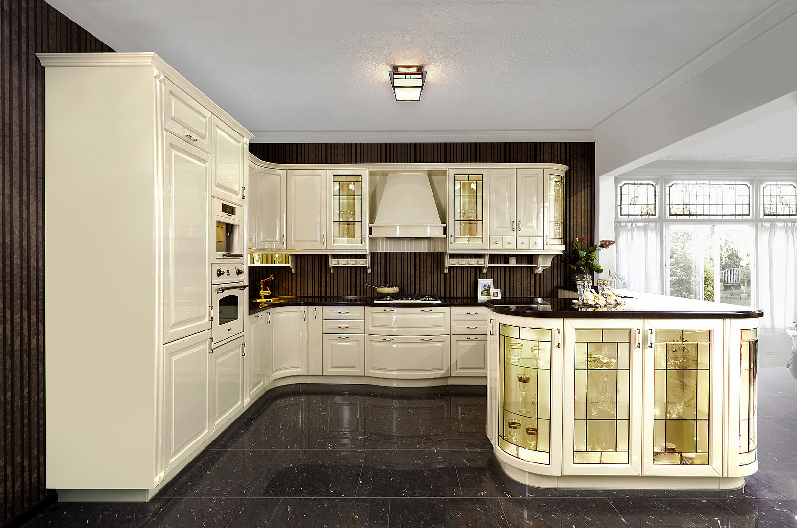 Kuchyňská sestava je prosvětlena vitrážemi s vnitřním osvětlením, jenž vystavují na obdiv sváteční sklo používané při slavnostních událostech.
